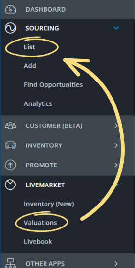- Valuations tab → now located under Sourcing > List