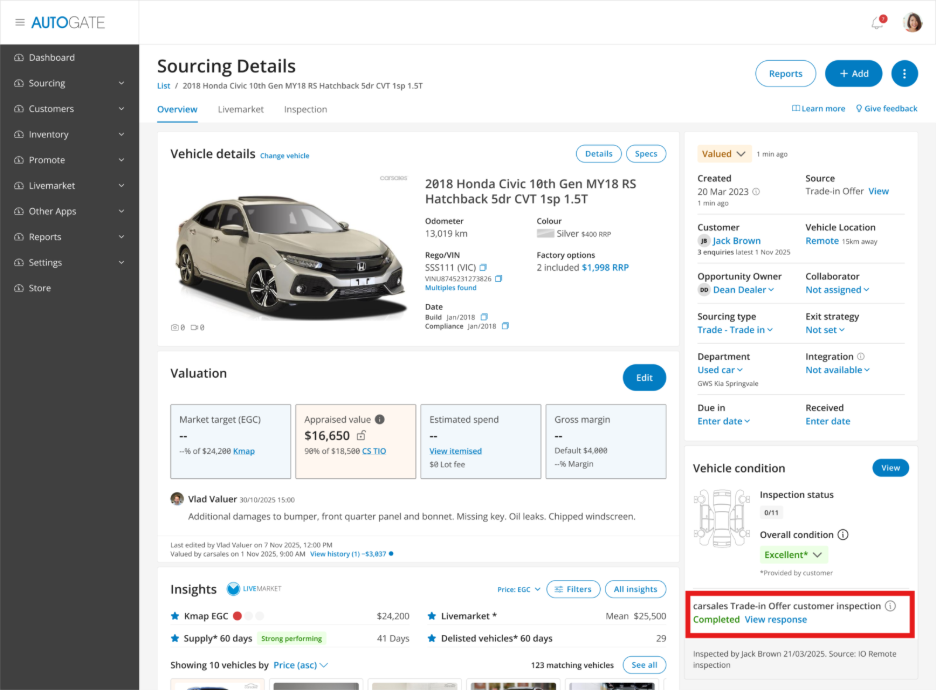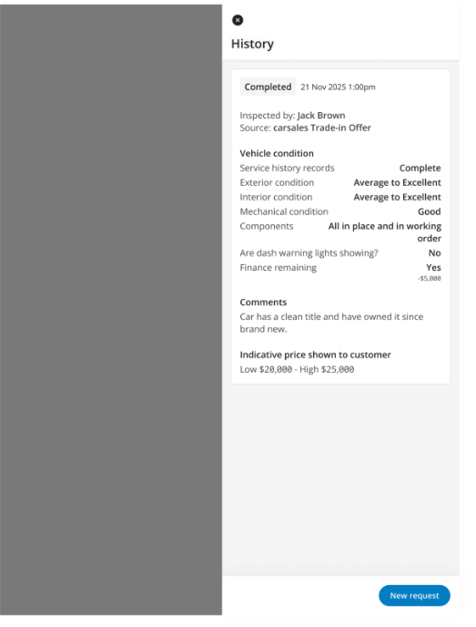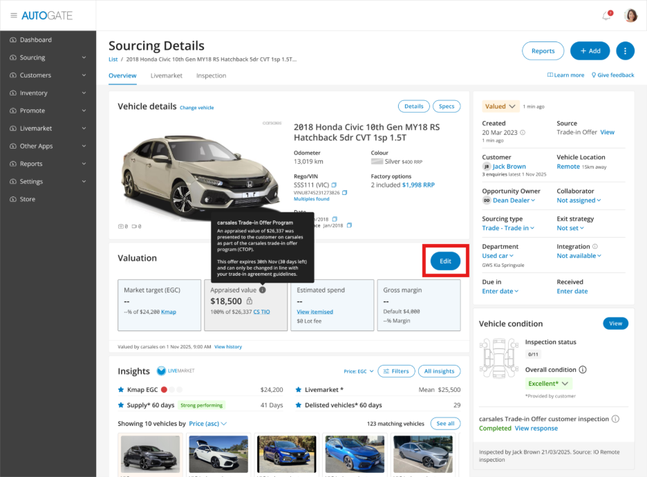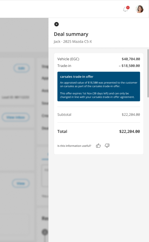 - Enquiries will display a carsales Trade-in Offer Program badge in the Customer page and will include details such as: