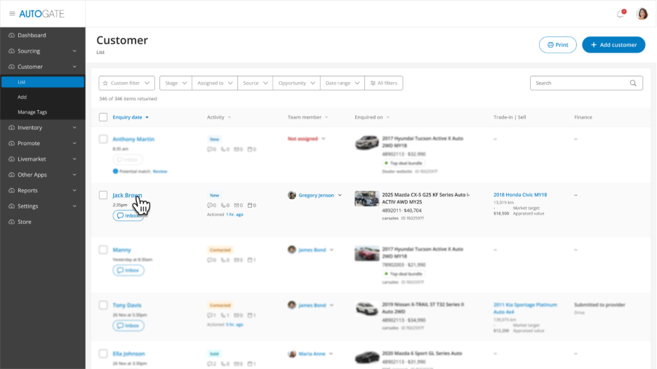 - Open the lead in AutoGate via the email/SMS link or navigate to the Customer list and select the item