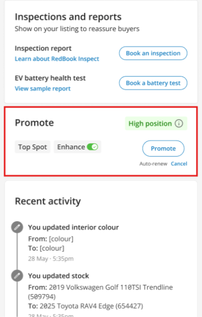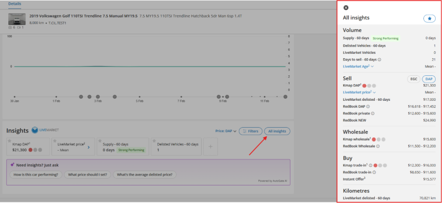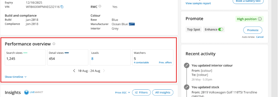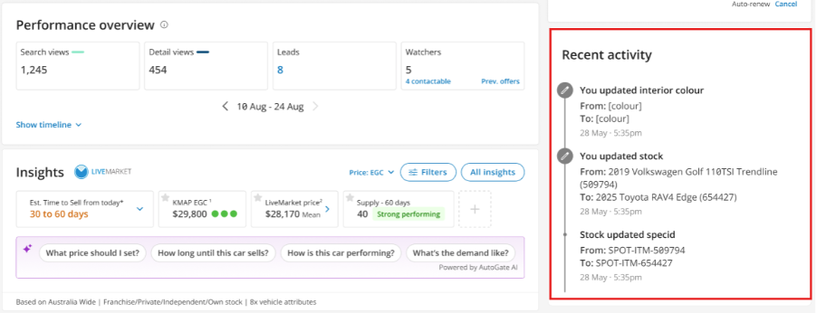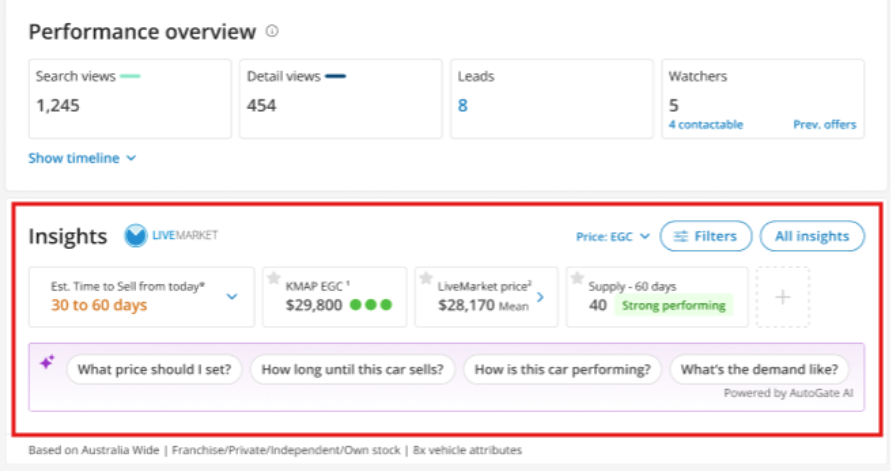 This allows you to view key market and pricing insights while reviewing a listing, without needing to switch between pages or tools. Having these insights alongside vehicle details and performance helps provide additional context when assessing how a vehicle is tracking and deciding on next steps.