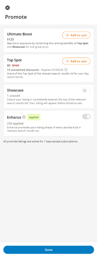 Tags indicate any active Promote products applied to the listing, such as Ultimate Boost, Top Spot, Showcase, or Enhance.