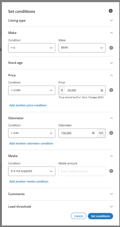 This is where you define the details for the rule, such as listing type, odometer range, make, price, and more.