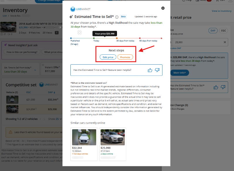 Clicking on the 'Est. Time to Sell' tile AND the 'How long until this car sells?' AI prompt will open the ETTS pop up which includes more detail.