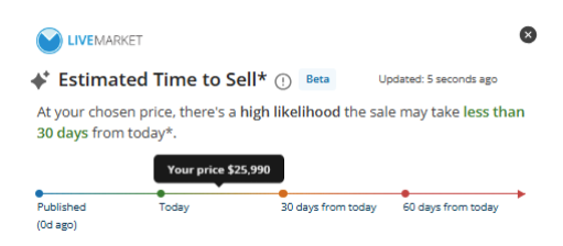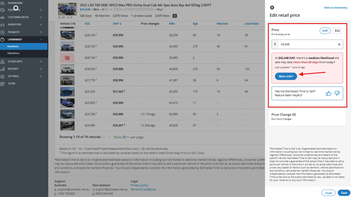 Estimated Time to Sell is an AI-generated, data driven estimate of how long it’s likely to take for a vehicle to sell from today, based on LiveMarket data on carsales.