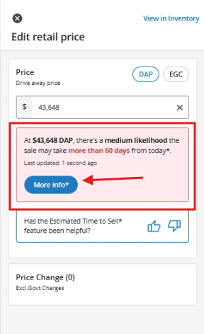 In the Edit retail price side panel (available from the LiveMarket inventory details page and Listings page). Selecting More info opens the ETTS pop‑up, which provides a more visual view with additional detail