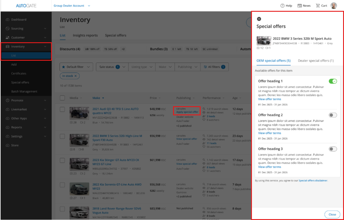 You can activate available Special Offers directly from your Inventory List page in AutoGate. Once activated, it will be visible on the listing on carsales within a few minutes.