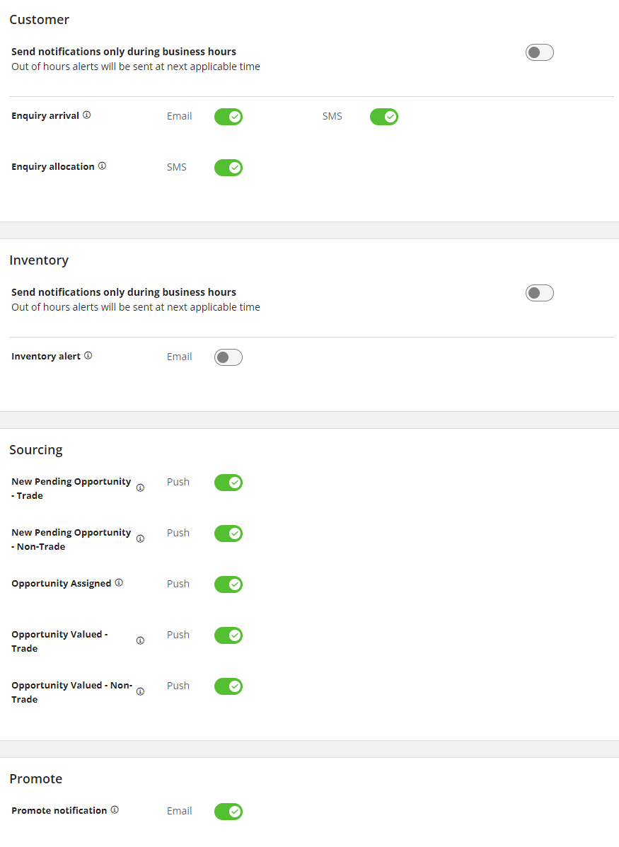 Enquiry arrival: Opt to receive notifications when a lead is received by selecting email/SMS or both.
